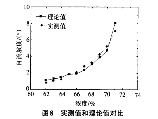 由图8所示 ,相比Sofra&Boge公式 ,此经验公式的自流坡度理论值不仅在低浓度时和实测值 吻合 ,高浓度时也达到了较高的精度 。