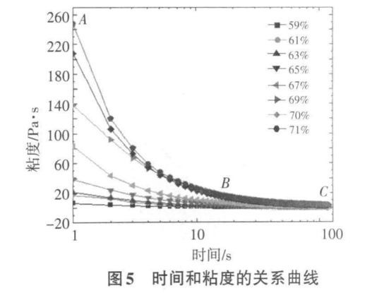 由图5和图6可知 ,随着剪切速率由零开始增大,膏体结构遭到破坏,表观粘度迅速减小,浓度越高,这种现象越明显,流变曲线偏向剪切速率轴,,如图5中AB段。剪切速率继续增大,即图5中BC段,在这一阶段,膏体性能稳定,表观粘度减小规律趋于平缓,剪切应力与剪切速率近似线性规律,且在相同条件下,浓度越大,表观粘度和剪切应力也越大。