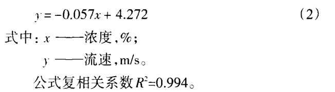 浓度和流速关系曲线如图4所示,将,数据结果进行回归分析,得到回归方程式(2)。 由式(2)看出在实验的范围内,流速和浓度基本上呈线性关系,流速随着浓度的增大而减小 ,这也是浓度越大,流动性越小的缘故。
