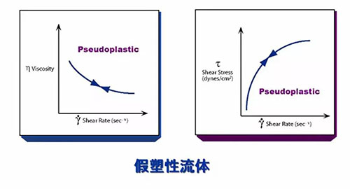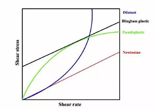 其中,我们最为注重的几类分别为假塑性流体(下图绿线)、宾汉流体(下图黑线)及触变性流体。