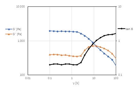 如果材料具有屈服点,则屈服点以下发生较小的应变时,储能模量(弹性行为)占主导作用,并且在一定的应变范围内,两种模量均保持在一个恒定的水平,与应变的变化无关。该区间发生的形变为弹性形变,被称为线性粘弹区间。随着应变的不断增加,两种模量不再保持恒定,此时即为线性粘弹区间的终点,也是屈服点。随后,样品的内部结构开始发生不可逆的破坏。如果G' 和G''这两条曲线有交叉点,则可以读取此时的应力值,作为样品的流动点。