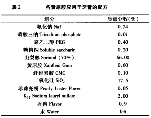 (2)将黄原胶与 CMC 复配使用 ,可得到不同流变性能的膏体,牙膏假塑性和触变性大小为:TP1—xanthan HITEX80 > TP3 一 xanthan 80HS/TP2 一xnathan 80 >TP4 一xnathan clear80。说明黄原胶 HI一TEX80 与 CMC有更好的协同性,可以制作较好流动性,站立性和分散性的牙膏。