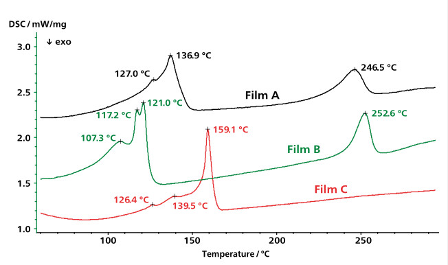 DSC 测试 3 种不同聚合物薄膜包装袋。样品质量:0.692mg(样品 A),1.45mg(样品 B),0.919mg(样品 C)。坩埚:Al,加盖扎孔。