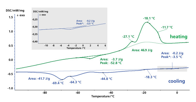 DSC 3500 Sirius 同样适用于食品行业的研究。这里我们给出了菜籽油的 DSC 测量结果。样品首先冷却到 -150℃,再加热至 40℃。冷却速率为 10K/min,由于油的结晶,在 -18℃ 开始出现放热峰。曲线在 -45℃,-64℃,-69℃ 出现最小值,显示菜籽油主要成分为油酸、亚麻油酸和亚麻酸等各类饱和与不饱和脂肪酸。-4℃ 的放热峰可能为添加剂的结晶。在随之的升温过程中,在 -53℃ 出现冷结晶峰,接着是菜籽油各组分的熔融峰(峰值温度 -27℃,-18℃ 与 -12℃)。
