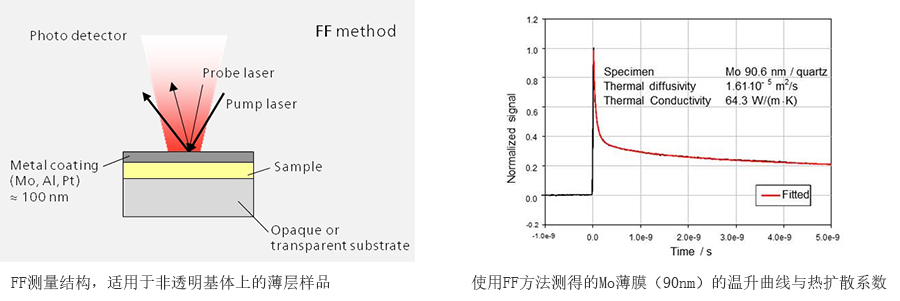 除了 RF 方法之外,测量也可以使用前部加热/前部探测(FF)的结构进行。“Front”一词这里指的是沉积于基体上的薄膜的外表面,而“Rear”一词指的是薄膜与基体接触的一面。