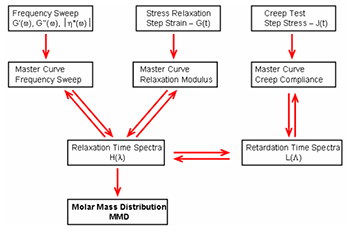 通过不同温度下的频率扫描,应力松弛和、蠕变实验,可以计算主曲线, 从而计算松弛时间谱;对于已知材料参数的聚合物(如 PS, PE, PP,