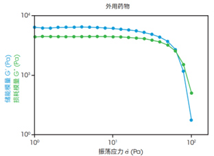 在此图中,在线性黏弹性区域以低应力测量的外用软膏显示出固体样行为(G'>G”)。应力增加导致软膏开始流动,显示的屈服应力为66Pa,这是确保有效分配、涂抹和稳定性的关键信息。
