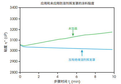 以下为在应用和未应用绝缘防溶剂挥发罩的情况下测量丙烯酸涂料在10s-时的黏度。在未加盖的情况下,涂料在边缘干燥时会增加扭矩,表现为黏度增加。安装防溶剂挥发罩后,干燥的影响被消除,因此可精确测量涂料黏度。
