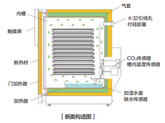 过电流漏电保护开关、独立过升防止器、温度上下限异常、CO2浓度上下限异常、自诊断功能、门打开报警、加湿水缺水报警(热敏电阻)、按键锁 |